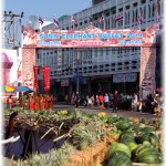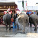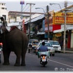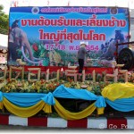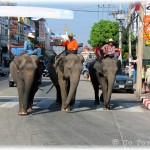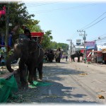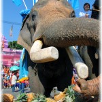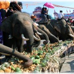 of the city, converging at the Phraya Surin Phakdi Si Narong Chang Wang Monument. It is here where the elephants literally feast on tons of food. In 2003 a Guinness World Record was broken in Surin when 269 Asian elephants ate over 50 tons of food (110,000 lbs). There are offerings of bananas, pineapples and mangos for the elephants to chow-down on. The stands of food for the elephants line the streets, and by the time the frenzy is complete it looks like a tornado touched down. It’s a very rare opportunity to see hundreds of elephants gathered in one central place. What gives this an even more surreal feeling is the ability to be right in the thick of it, with towering elephants walking all around you. You are able to get so close as to have your own photo-op, touch/pet, feed and ride the gentle giants. The elephant buffet brings the term ‘concrete jungle’ bursting to life. It is an awesome spectacle!
